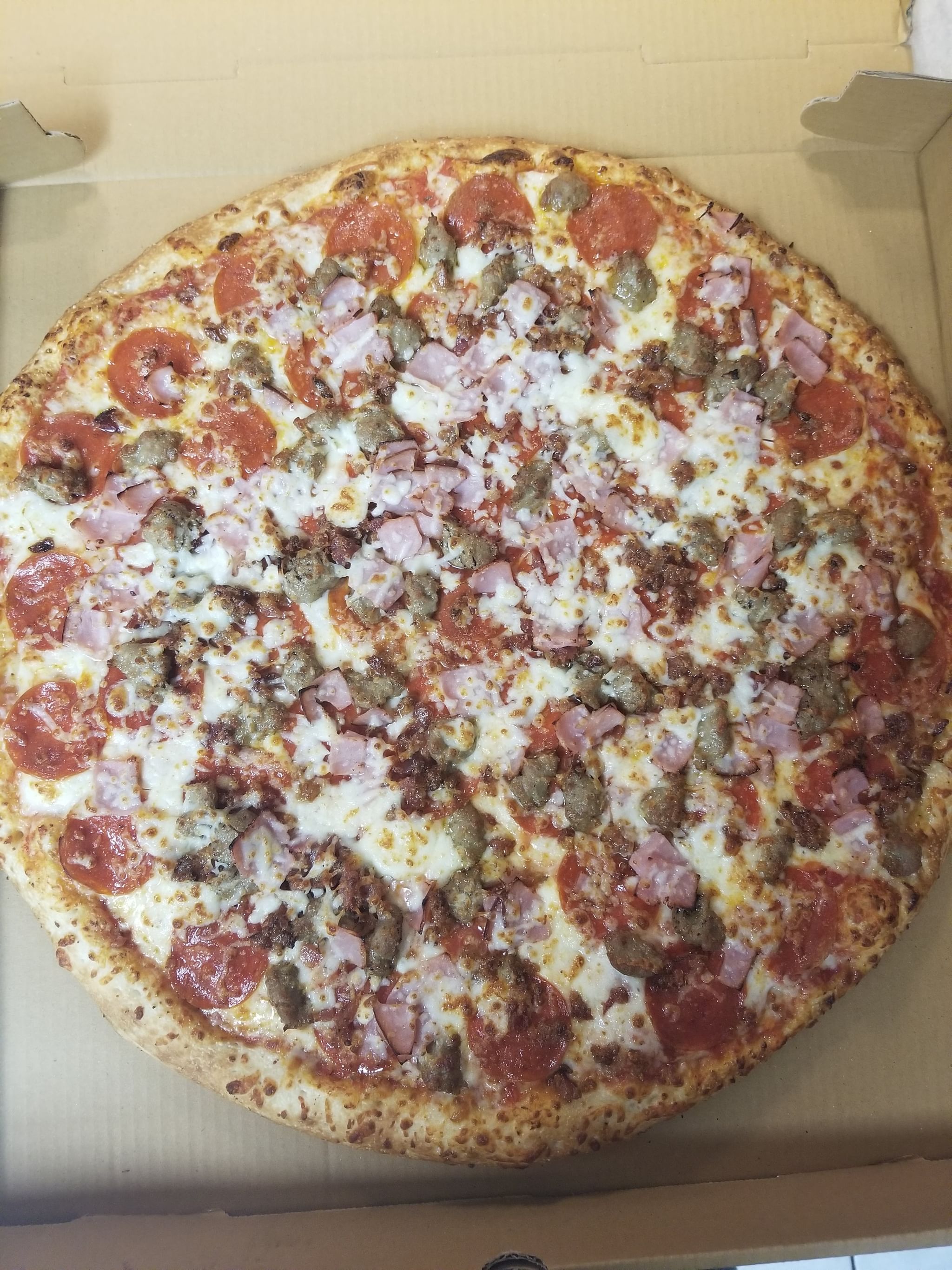 Pepperoni, sausage, peppers, onions, mushrooms, ham & black olives