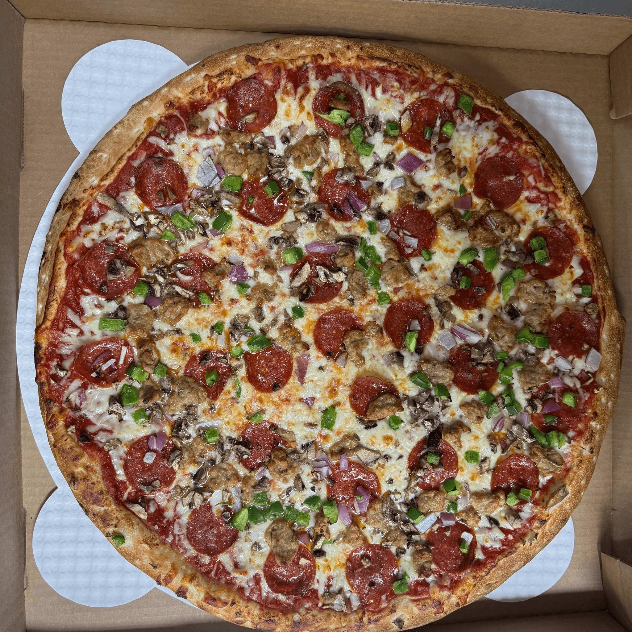 Pepperoni, sausage, peppers, onions, & mushrooms