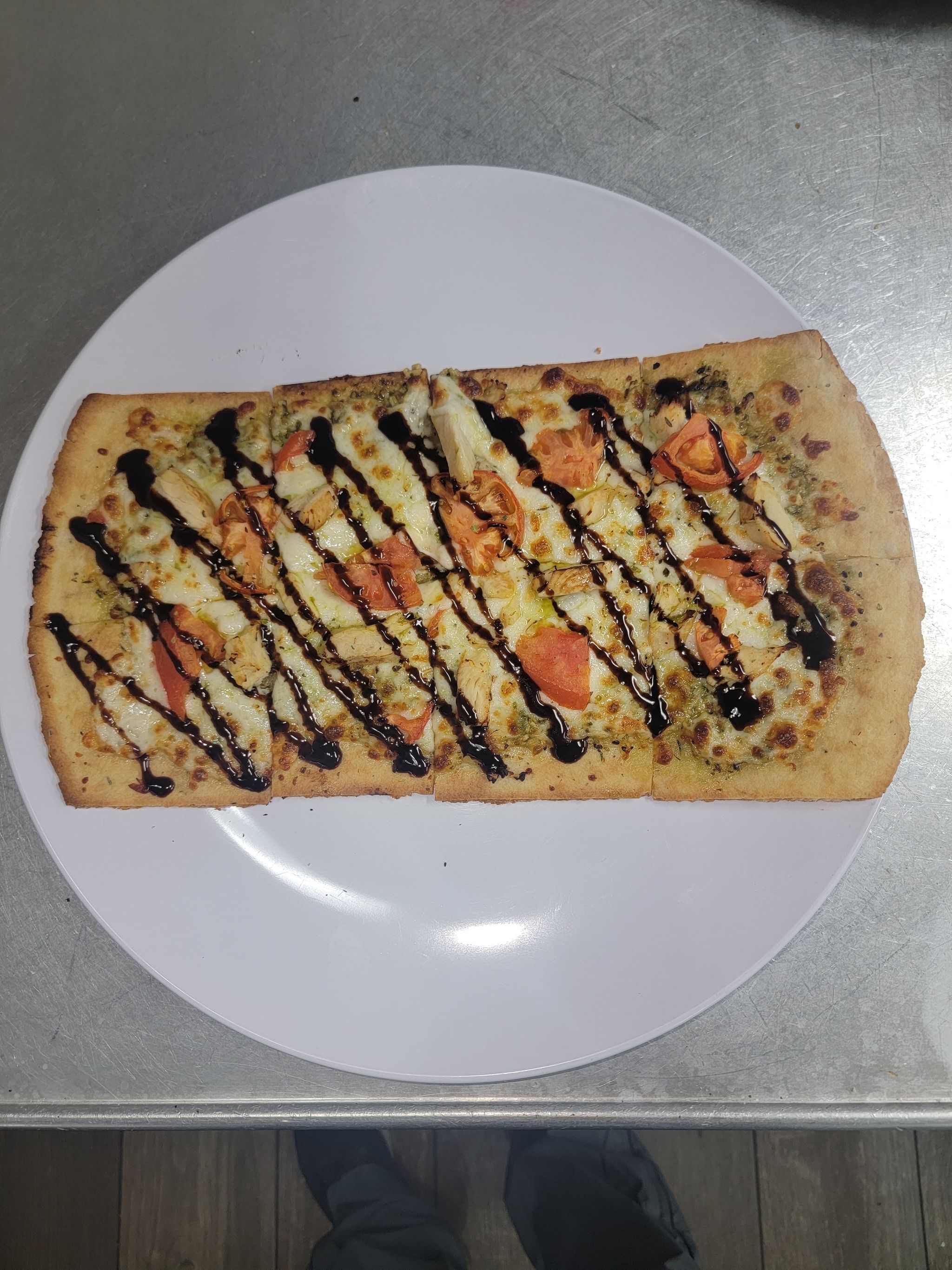 Pesto, garlic, grilled chicken, tomatoes & mozzarella cheese drizzled with balsamic glaze